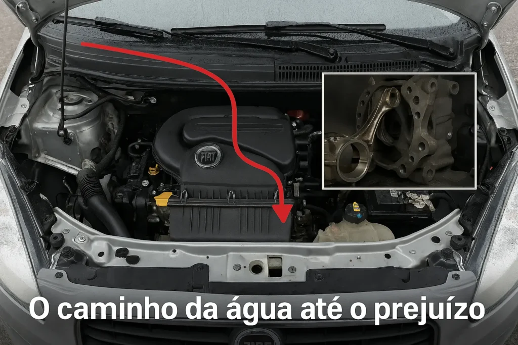 Estamos falando do Calço Hidráulico, um problema grave que acontece quando a água entra na câmara de combustão. Como a água não se comprime como o ar, o pistão tenta subir, bate na “parede” de água e entorta as bielas, destruindo o motor instantaneamente.