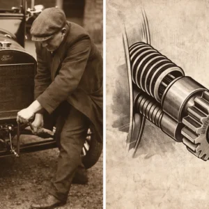 Antes da partida elétrica, o motorista precisava encaixar uma manivela de ferro na frente do carro e girá-la com toda a força para que o motor “pegasse no tranco”. O grande perigo era o “coice” (kickback). Se o motor combustionasse no momento errado, ele girava a manivela violentamente para trás.